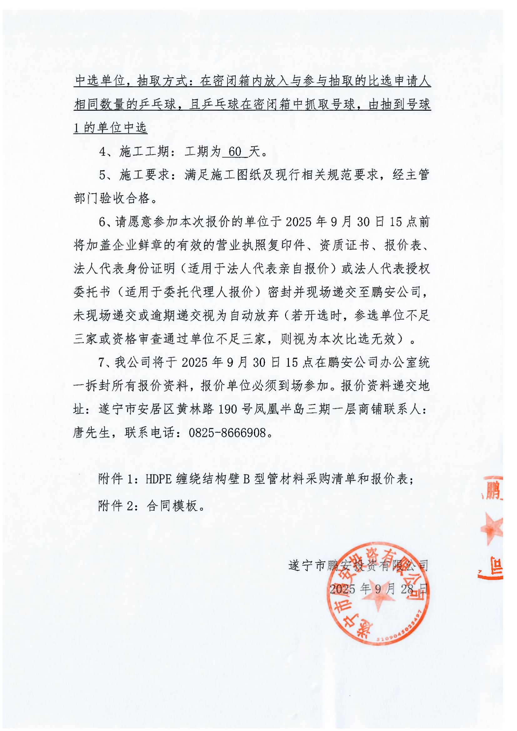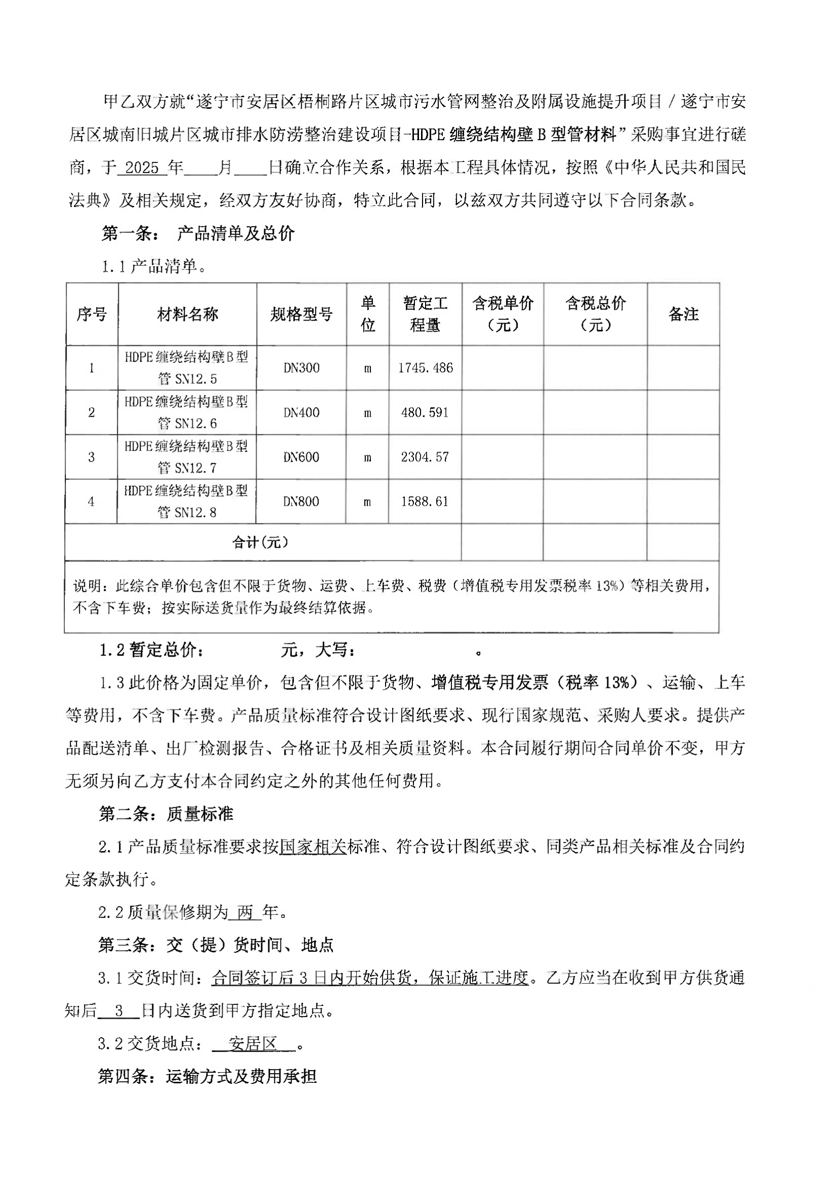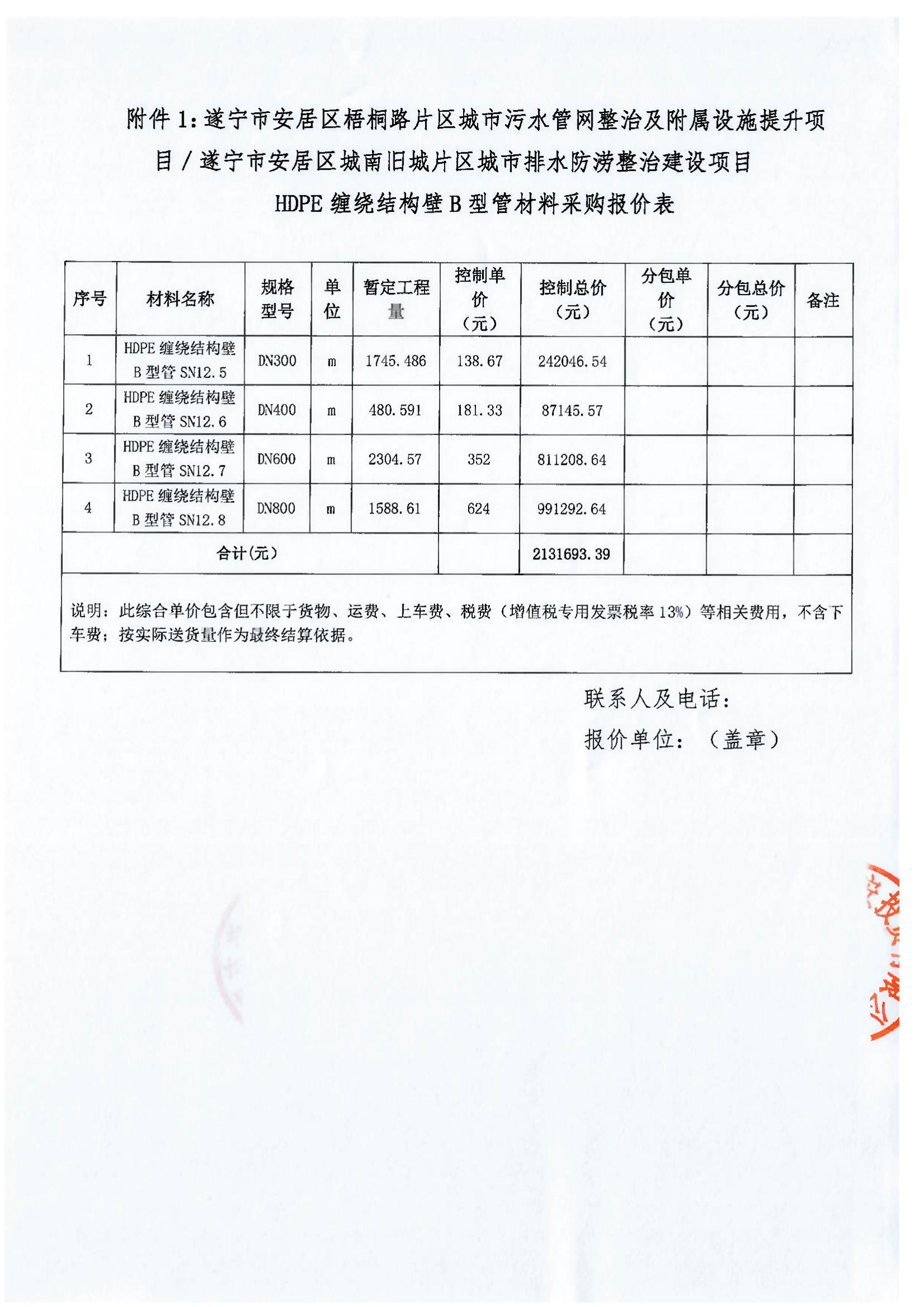 遂宁市安居区梧桐路片区城市污水管网整治及附属设施提升项目/遂宁市安居区城南旧城片区城市排水防涝整治建设项目HDPE缠绕结构壁B型管采购报价比选邀请函