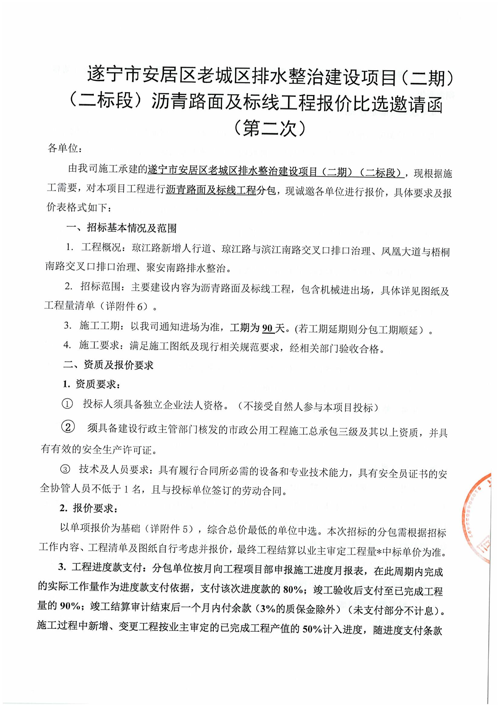 遂宁市安居区老城区排水整治建设项目(二期)(二标段)沥青路面及标线工程报价比选邀请函 (第二次)